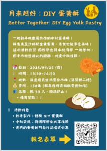 Crispy layers, sweet filling, and a golden yolk inside—sounds yummy, right? 😋 Come join fellow students in our festive DIY work, where baking meets friendship! 欸~你是說你連蛋黃酥都沒做過嗎?只會張大嘴等著吃而已???? 哈哈,來啦!這次活動超適合你這種新手,親手捏出金黃酥脆的蛋黃酥,邊做邊聊,月做月好~~ 歡迎來體驗中秋手作的樂趣,順便認帶著你的國際生朋友一起來體驗台灣最好吃的(要胖一起胖!)。名額只有30個,先搶先贏! You know what the Mid-Autumn Festival is all about? You're in Taiwan, so get with the vibe! Come make some crispy yolk pastries with us! Hang out, meet cool peeps from Taiwan and all over the world, and eat till we all get chubby—faces as round as those yummy pastries! 😜Only 30 spots, so grab yours quick or cry later! 🗓 活動時間|Date & Time 9/25 (四) 13:30–16:30 Sep 25th (Thu.), 13:30 PM – 16:30 PM 📍 活動地點|Venue 集賢館2樓 無邊境員生消費合作社 Ji-Xian Hall 2F, Borderless Students’ Co-op 👥 參與對象|Participants 東華國際學生與本校學生 NDHU International & Local Students 🎯 活動亮點|Highlights ・自己做的蛋黃酥(最好吃)!Create your own Egg Yolk Pastry ! 主辦單位|Organizer 社會責任行動中心 (Email: techusr@gms.ndhu.edu.tw)(Phone number: 03-8903771) 📌 名額有限,歡迎提前報名!(如有報名成功,會發信件通知!) The number of places is limited, welcome to register in advance! (If your registration is success, you will be notified by email!) 🌕備有茶點歡迎享用 We’ve prepared some refreshments—feel free to help yourself and enjoy!