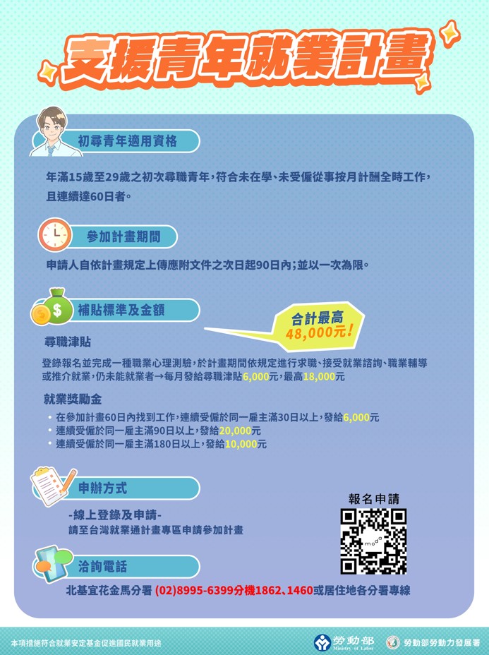 一、勞動部為執行「因應國際情勢支持勞工安定就業辦法」,協助初次尋職青年(下稱初尋青年)穩定就業,自114年9月1日推動「支援青年就業計畫」,強化原「初次尋職青年穩定就業計畫」,及早對畢業後尚未就業之初次尋職青年提供就業協助。 二、旨掲計畫係針對15歲至29歲,未在學且未就業連續60日以上之初次尋職青年,提供就業諮詢、輔導及推介就業,求職期間每月發給尋職津貼新台幣(下同)6千元,累計最高1萬8千元,受僱滿一定日數發給就業獎勵金累計最高3萬6,000元。合計補助金額最高4萬8千元(計畫簡介如附件,詳見專區網站https://gov.tw/Sox)。 🔥更多徵才、就業、考試、實習、職涯講座訊息,請上學務處畢業生及校友服務組網站🔥 https://rb005.ndhu.edu.tw/p/412-1005-493.php