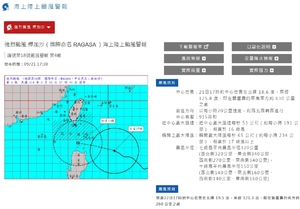 中央氣象局已於17:30發布編號第18號強烈颱風「樺加沙(RAGASA)」海上、陸上颱風警報, 「樺加沙颱風」目前中心位置在鵝鑾鼻的東南東方約 630 公里之海面上,以每小時20公里速度,向西北西轉西進行,近中心最大風速每秒 53 公尺(約每小時 191 公里),相當於 16 級風