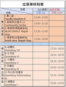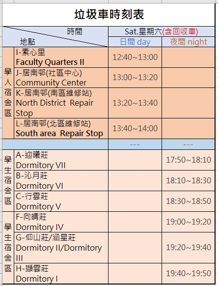 一、因應教師節連續假期,垃圾清運服務時間調整如下: (一) 9月27日(週六):日間時段停收學生宿舍區,調整至教職員宿舍區收取垃圾(詳細時刻表請參考附件),夜間時段學生宿舍區照常清運。 (二) 9月29日(週一): 全校垃圾清運服務暫停一日。 二、為推動校園永續及環境保護,請使用環保餐具,減少使用一次性餐具。 總務處環境保護組敬啟