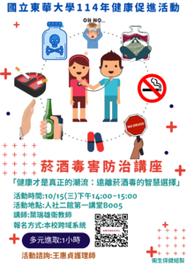分類: 活動公告 來源: 學務處衛生保健組 - 王惠貞 - labi@gms.ndhu.edu.tw - 電話8906253 對象: 全校教職員_全校學生_兼任教師 標題: 【健康促進講座】健康才是真正的潮流:遠離菸酒毒的智慧選擇 日期: 2025-09-25  ( 星期四 )  16:27 附檔: 菸酒毒害防治講座海報.png (610 KB)