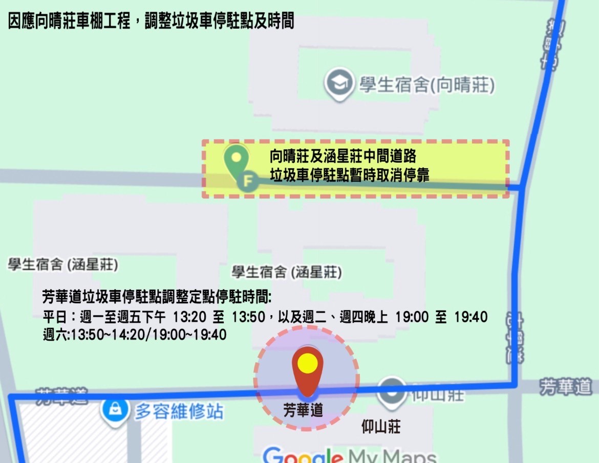一、原「向晴莊」及「涵星莊」中間道路垃圾車停駐點將暫時取消。 改至「芳華道」路段停駐(如附圖),停等時間調整如下: