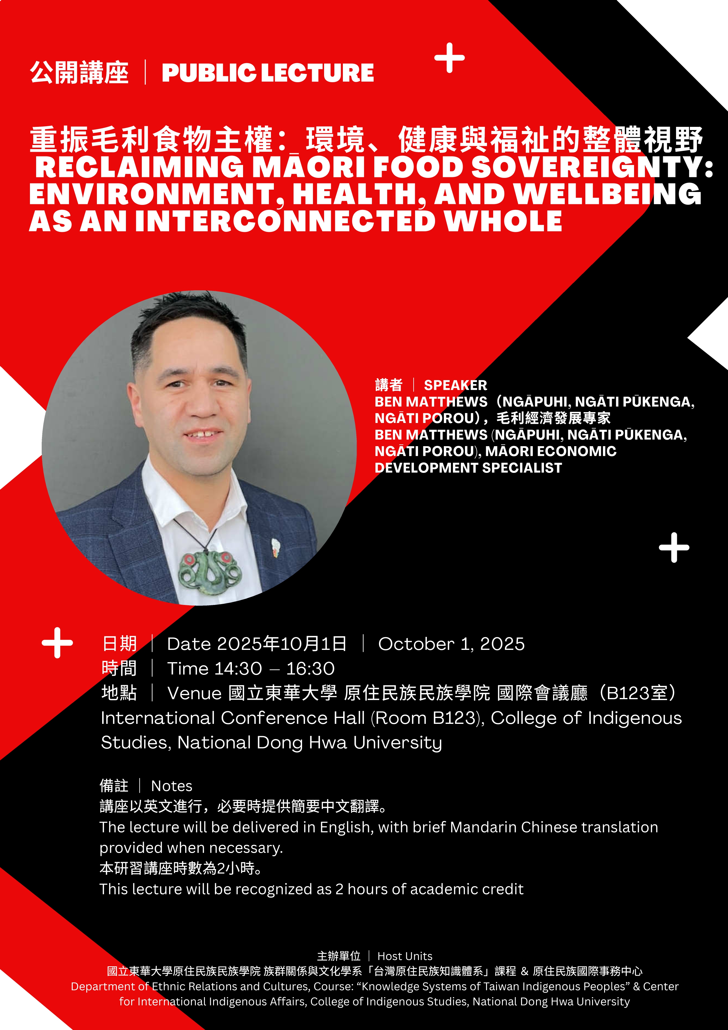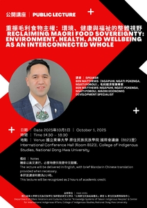 【Title】 Reclaiming Māori Food Sovereignty: Environment, Health and Wellbeing as One Interconnected 【Synopsis】 This presentation explores Indigenous food sovereignty from a Māori perspective, emphasizing the interconnectedness of environmental stewardship, food sovereignty, and Māori health outcomes. Māori approaches to food sovereignty are grounded in mana motuhake (self-determination), kaitiakitanga (guardianship), and whanaungatanga (relationships). For Māori, food sovereignty means the right to define and sustain kai (food) in ways that honor whakapapa (ancestral connections) to land, waters, and culture. Examples will demonstrate the integration of Western science and traditional knowledge systems, as well as the revitalization of traditional practices in contemporary contexts. The presentation also examines how Māori are asserting rangatiratanga (leadership, sovereignty) across supply chains, creating sustainable and climate-resilient food futures. 【Date】 October 1, 2025 【Time】 2:30 – 4:00 PM 【Venue】 International Conference Hall, College of Indigenous Studies, National Dong Hwa University (Room B123) This public lecture is co-organized by the “Knowledge Systems of Taiwan Indigenous Peoples” course, Department of Ethnic Relations and Cultures, College of Indigenous Studies, and the Center for International Indigenous Affairs, National Dong Hwa University. The lecture will be delivered in English, with brief Chinese translation provided when necessary. 【Speaker Profile】 Ben Matthews (Ngāpuhi, Ngāti Pūkenga, Ngāti Porou) is a Māori economic development professional with 17 years’ experience across New Zealand government agencies, specializing in iwi engagement, Māori economic development, and international partnerships. He has advanced Māori leadership in trade, agribusiness, and primary industries. Ben has also led Māori engagement in education and agriculture, supporting iwi partnerships and student success at Lincoln University, Taratahi Agricultural Training Centre, and Telford Agricultural Training campus. A native speaker of te reo Māori and fluent in Japanese, he fosters Indigenous collaboration globally while championing Treaty-centric approaches in Aotearoa. He is currently a Senior Policy Analyst in the Trade and International Relations Directorate of the Policy & Trade Branch at the New Zealand Ministry for Primary Industries, focusing on advancing Māori global trade. 【Registration website】https://sys.ndhu.edu.tw/SA/XSL_ApplyRWD/ActAnnounce.aspx?ActID=27090