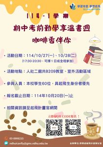 📣「期中考前勤學享温書週,咖啡香伴你!」(可擇1日參加,亦可2日全程參加)