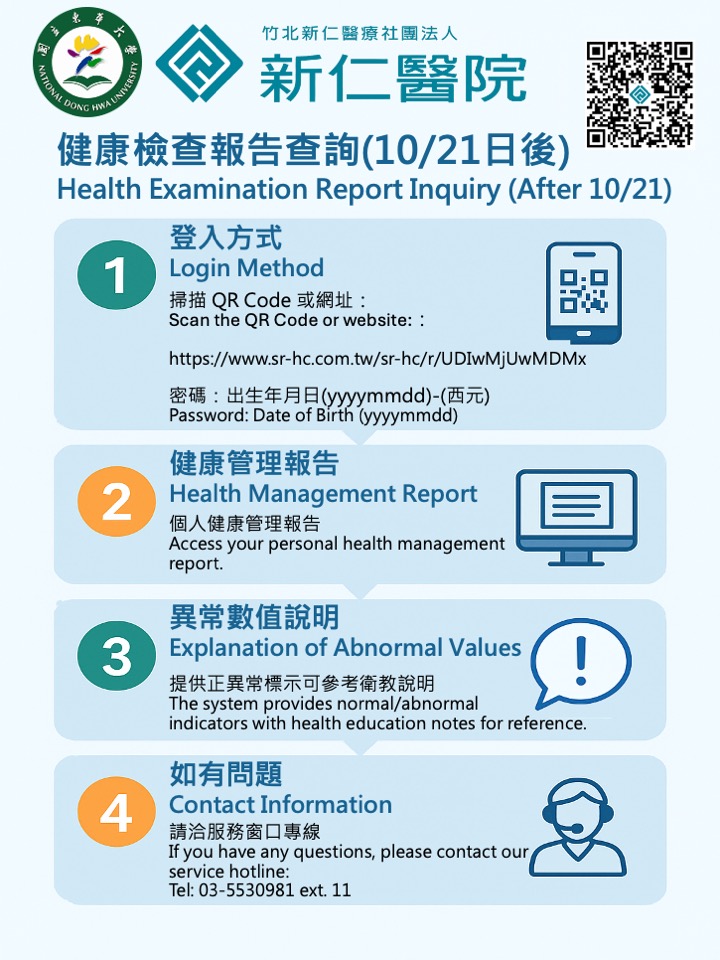 同學平安 參加本校9/13、9/20健檢的同學請注意,健康檢查報告查詢將於10/21日後開放查詢。 查詢網址: https://osa.ndhu.edu.tw/p/412-1005-15280.php?Lang=zh-tw 查詢步驟請參考附件 Students who participated in the September health check-up should check their health examination reports online after October 21. For inquiry procedures, please refer to the attachment. Query URL: https://osa.ndhu.edu.tw/p/412-1005-15280.php?Lang=zh-tw 諮詢專線:8906253王惠貞護理師
