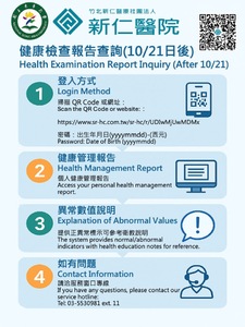分類: 行政公告 來源: 學務處衛生保健組 - 王惠貞 - labi@gms.ndhu.edu.tw - 電話8906253 對象: 全校教職員_全校學生 標題: 114年度9月健康檢查報告查詢將於10/21日後開放查詢 Students who participated in the September health check-up should check their health examination reports online after October 21. 日期: 2025-10-02  ( 星期四 )  08:17 附檔: 健檢報告查詢步驟圖.jpg (185 KB)