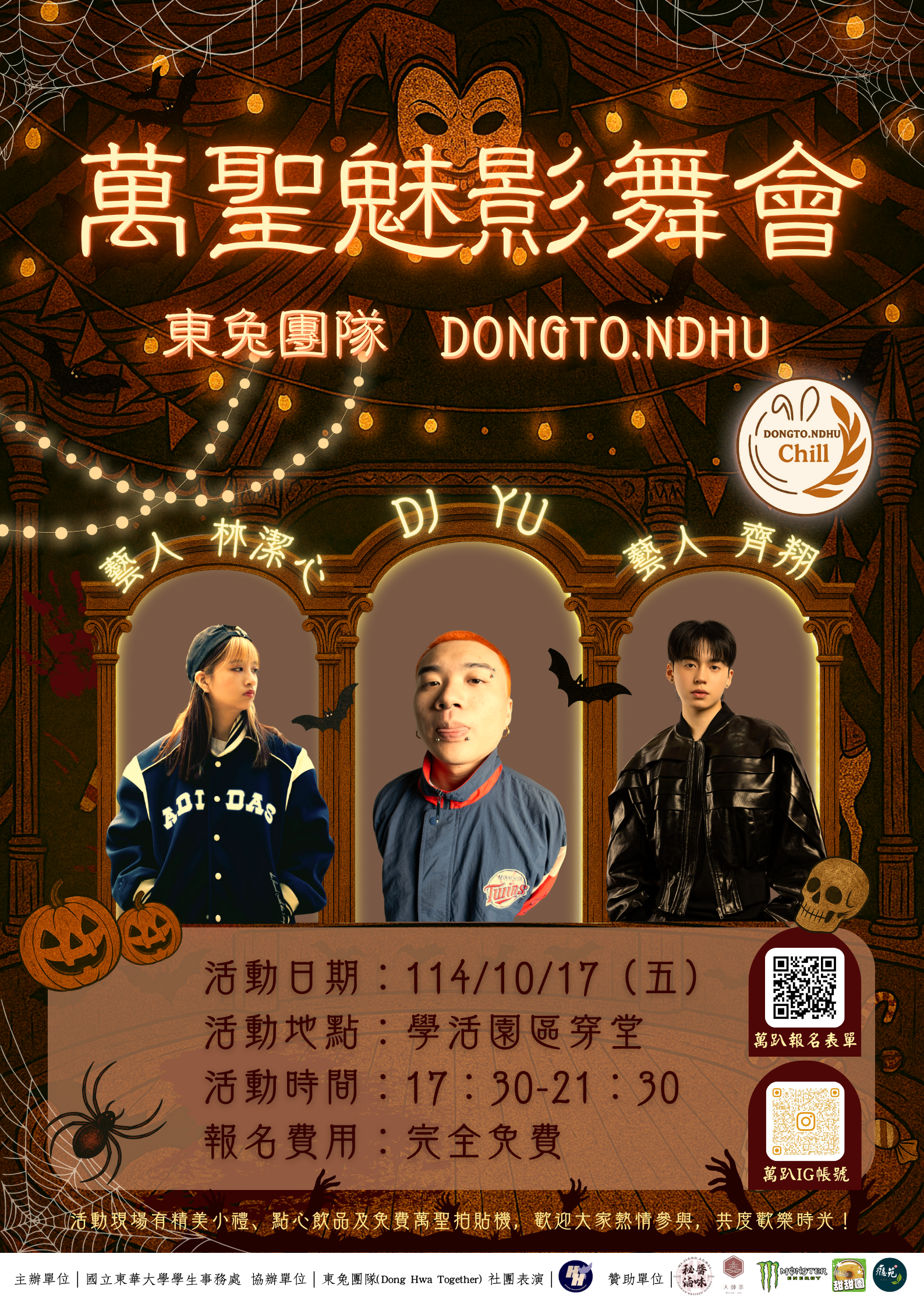 親愛的同學好! 今年最盛大的萬聖狂歡夜來啦!本次東兔團隊舉辦的「萬聖魅影舞會」」將為大家帶來充滿驚喜與創意的夜晚。現場不僅有人氣藝人齊聚帶來熱力四射的表演,還有萬聖魅影走秀,讓你展現最狂、最炫的造型!同時準備了獨家主題拍貼機,讓你留下萬聖最炸美照,更有神秘獎品等你拿!快點手刀報名,和我們一起嗨翻全場吧! 一、活動日期:114年10月17日(五) 18:00~21:00(17:30開放入場) 二、活動地點:學活園區穿堂 三、參加對象:東華大學全校師生皆可報名 四、活動名額:預計250名 五、活動特色: ✅ 人氣藝人驚喜表演 🎤 ✅ 萬聖魅影走秀 👗 ✅ 獨家萬聖拍貼機 📸 ✅ 神秘獎品等你抱走 🎁 六、報名截止及錄取日期:即日起至 10月14日(二) 中午12:00 止,採線上報名,將於 10月15日(三) 採電子郵件方式寄發錄取通知(依據報名順序方式錄取)。 七、報名連結:https://forms.gle/ANJ8hTCLvG8caov38 八、主辦單位: 國立東華大學學生事務處/東兔聚樂團隊 Chill 九、聯絡窗口:東兔聚樂團隊chill@gms.ndhu.edu.tw