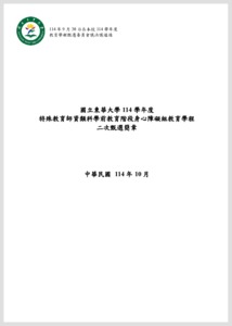 分類: 活動公告, 招生公告, 其他公告 來源: 師資培育中心 - 陳淑貞 - sjchen@gms.ndhu.edu.tw - 電話(03)8906636 對象: 全校教職員_全校學生 標題: 🌟學前特教學程二次甄選開跑!加入讓孩子閃亮的教育現場! 日期: 2025-10-08  ( 星期三 )  16:05 附檔: 114學年度學前特教學程甄選簡章(二次甄選).pdf (805 KB)   114學年度學前特教學程二次甄選簡章總附件(已編輯頁碼供考生使用).doc (155 KB)   學生線上申請證件系統操作說明.pdf (1 MB)