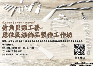 📣【原資活動|在地創生 × 職涯探索】 🪶 原住民族骨角貝類飾品製作工作坊|職涯體驗+手作創意 🪶 您有想過您的職涯可以怎麼跨出教室,踏入文化工藝現場嗎? 這堂課不只是飾品工作坊,更是一場職涯探索之旅——讓你透過動手製作,理解原住民族如何運用素材、技法與文化智慧,並思考這樣的工藝能如何成為人生可能的一環。 這場工作坊邀您一邊體驗原住民族飾品的製作流程,一邊思考自己的職涯方向:您是否也能在文化創意、手作工藝、藝術設計等領域找到自己的路? 歡迎對原住民族文化與職涯探索有熱忱的您一起參與,拓展視野、動手實作! ✨ 活動資訊 📅 日期:10/23 (四) 14:10–17:00 📍 地點:原民院 A123 👤 講師:王昱心主任及林盛火老師 🕗 報名截止:10/23 上午 08:00 🔗 跨域報名連結:https://reurl.cc/4NK8lK 📌 原資活動:推動原住民族文化資源傳承,並促進學生職涯探索