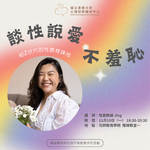 💛諮商中心這學期的性平活動熱烈報名中💛 歡迎有興趣的同學一同來參加很期待能夠跟同學們見面,名額有限,趕快去報名吧>w< ☆.。. *.。. *.。. *.。. *.。. *.。. *.。. *.。. *.。. *.。. *.。. *☆ 【談性說愛不羞恥-給Z世代的性教育課程】 講 師|性愛教練 Jing 時 間|2025/11/10(三) 18:30-20:30 地 點|花師教育學院 階梯教室一 報名網址:https://sys.ndhu.edu.tw/SA/XSL_ApplyRWD/ActAnnounce.aspx?ActID=27855 ☆.。. *.。. *.。. *.。. *.。. *.。. *.。. *.。. *.。. *.。. *.。. *☆