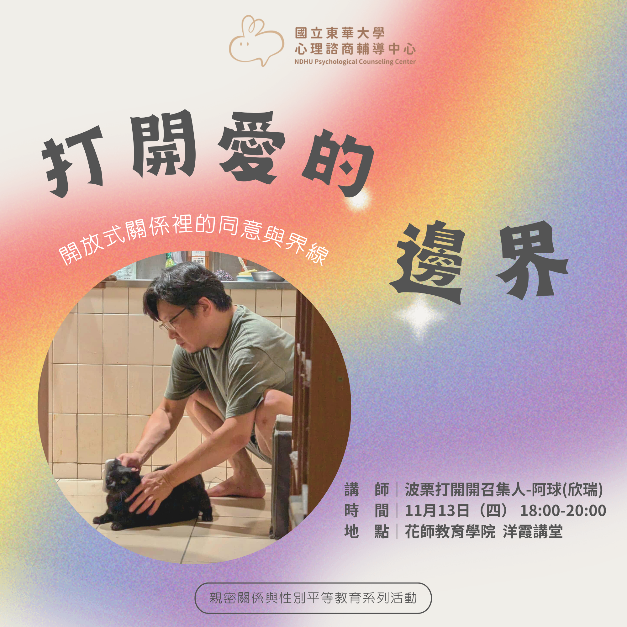 💛諮商中心這學期的性平活動熱烈報名中💛 歡迎有興趣的同學一同來參加很期待能夠跟同學們見面,名額有限,趕快去報名吧>w< ☆.。. *.。. *.。. *.。. *.。. *.。. *.。. *.。. *.。. *.。. *.。. *☆ 活動名稱【打開愛的邊界-開放式關係裡的同意與界線】 講 師|波栗打開開召集人 阿球(欣瑞) 時 間|2025/11/13(四) 18:00-20:0 地 點|花師教育學院 洋霞講堂 報名網址:https://sys.ndhu.edu.tw/SA/XSL_ApplyRWD/ActAnnounce.aspx?ActID=27856 ☆.。. *.。. *.。. *.。. *.。. *.。. *.。. *.。. *.。. *.。. *.。. *☆