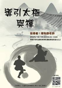 各位教職員生大家好: 東華大學三慧學社將於2025年10月19日(日)早上9:30至12:00於花師教育學院潛能開發教室A212舉辦導引太極與禪。內容以養生導引操為暖身,帶入太極拳的的基本律動,再從太極道法談禪。歡迎大家來參加。 社長 彭文平 ☯️導引太極與禪🙏 🕤日期:10月19日 上午9:30-12:00 🏛地點:東華大學 花師教育學院 A212教室(潛能開發教室) ✴️指導者:陳怡靜老師(東華大學體育中心教師,專長是身心學、潛能開發、太極拳、身心整合、有氧舞蹈、舞蹈創作表演) ❇️主辦單位: 東華大學三慧學社 花蓮縣祖師禪學社 ⬇️報名連結 https://forms.gle/wsDwzxt1KEEEfxcGA