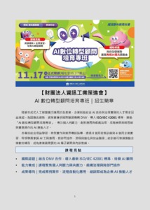 分類: 其他公告 來源: 學務處畢業生及校友服務組 - 黃文雯 - wenwen@gms.ndhu.edu.tw - 電話6283 對象: 全校教職員_全校學生 標題: 【轉知】財團法人資訊工業策進會辦理經濟部AI新秀計畫-「AI數位轉型顧問培育專班」延長報名期限至10月27日止 日期: 2025-10-17  ( 星期五 )  13:51 附檔: AI 數位轉型顧問培育專班招生簡章(延長報名至10月27日).png (627 KB)   AI 數位轉型顧問培育專班招生簡章(延長報名至10月27日).pdf (585 KB)