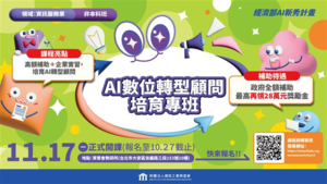 一、旨揭課程原訂報名期間至10月13日止,為使更多符合條件之畢業生得以參與本計畫,特將報名截止日期延長至114年10月27日(星期一)。 二、本計畫採「專業培訓+企業實習+就業媒合」整合式培訓模式,期協助待業青年順利接軌產業就業。 三、檢附「AI數位轉型顧問培育專班」招生簡章,報名網址為:https://ievents.iii.org.tw/EventS.aspx?t=0&id=3025。 🔥更多徵才、就業、考試、實習、職涯講座訊息,請上學務處畢業生及校友服務組網站🔥 https://rb005.ndhu.edu.tw/p/412-1005-493.php