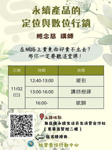 原本想在網路販售商品賺取小額收入, 結果卻賣不出去 (T ^ T) 那你一定要來聽這堂課! ~教你如何打造暢銷商品~ ~看懂網路流量密碼~ ★永續產品的定位與數位行銷★ 【日期】:114 年 11 月 02 日 (日) 【時間】:13:00 - 16:00 (12:40開始報到) 【地點】:無邊境合作社 (集賢館二樓) 【講師】:鮑念慈 老師 【報名連結】:https://forms.gle/P1RvPZ94Sha66KTp9 (報名成功將會於10/31(五)前寄發錄取通知) 【報名截止】:114 年 10月 31 日 (五) 【注意事項】:現場備有茶點,建議提早前往 如有疑問,歡迎來信sunny79115@gms.ndhu.edu.tw,或直接於無邊境合作社官方LINE詢問以便即時回覆(https://lin.ee/Gm0P6Lc)。