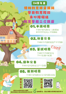 分類: 課程公告, 招生公告, 其他公告 來源: 師資培育中心 - 陳淑貞 - sjchen@gms.ndhu.edu.tw - 電話(03)8906636 對象: 全校教職員_全校學生 標題: 【特教學前學程二次甄選】114學年度特殊教育師資類科學前教育階段身心障礙組教育學程二次甄選簡章,歡迎踴躍報名 日期: 2025-10-30  ( 星期四 )  11:17 附檔: 114學年度學前特教學程甄選簡章(二次甄選).pdf (805 KB)   114學年度學前特教學程二次甄選簡章總附件(已編輯頁碼供考生使用).doc (155 KB)   學生線上申請證件系統操作說明.pdf (1 MB)   114年度東華大學學前特教學程二次甄選海報.png (3 MB)
