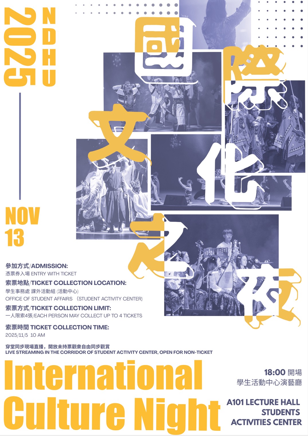 (English version below) 2025國際文化之夜將在11月13日(四)的18:00登場!今年有來自台灣、史瓦帝尼、菲律賓、印尼、印度、俄羅斯、越南及泰國等國家的國際學生一同演出,將他們國家的音樂、文化及服飾等透過舞台展現給大家,歡迎同學一同參與這場國際文化盛宴。 因場地座位有限,將採索票方式入場,為了維護演出的品質及安全,演藝廳不開放站票,但為了讓更多同學可以觀賞,學生事務處今年特別在學務處穿堂設置直播連線場,讓未持票的觀眾可以自由同步觀賞。詳細資訊如下: 日期:2025年11月13日(四) 時間:18:00開幕 地點:學生活動中心演藝廳(需持票)及學生事務處穿堂(直播連線,自由入座) 索票時間:2025/11/5早上10:00 索票地點:學生事務處課外活動組(C102) 索票方式:一人限索4張 入場注意事項: 1. 持票者請於17:30-17:50憑票進場,17:50後將需等候工作人員引導入場。 2. 17:50後,工作人員將視場內空位情形,開放無票者進場,座位滿後請至穿堂連線方式同步參與。 ✂ ━ ━ ━ ━ ━ ━ ━ ━ ━ ━ ━ ━ ━ ━ ━ ━ ━ ━ ━ ━ ━ ━ ━ ━ ━ ━ (English version) International Culture Night 2025 will begin at 18:00 on Thursday, November 13, 2025. This year, international students from Taiwan, Eswatini, the Philippines, Indonesia, India, Russia, Vietnam, and Thailand will showcase their countries’ music, culture, and traditional attire on stage. All students are warmly invited to join this multicultural celebration. Because seating is limited, tickets are required to enter the main venue. To ensure quality and safety, the auditorium will not admit non-ticket holders. To allow more students to watch, a live-stream viewing area will be set up in the Corridor of student activity center (穿堂) with open seating and no ticket required. Event Information: • Date: Thursday, November 13, 2025 • Time: 18:00 (Opening) • Venues: o Auditorium, Student Activities Center (ticket required) o Corridor of student activity center (穿堂) (live stream; open seating, no ticket required) Ticket Collection: • Start time: 10:00 AM, November 5, 2025 • Location: Office of Student Affairs (C102), • Limit: Up to 4 tickets per person Entry Notes: 1. Ticket holders may enter 17:30–17:50 with their ticket. After 17:50, please wait for staff to guide entry. 2. After 17:50, if seats remain, staff may admit non-ticket holders. Once seats are full, please proceed to the Corridor of student activity center live-stream area to watch the event. We look forward to seeing you there! 學生事務處課外活動組 Office of Student Affairs Student Activities Division
