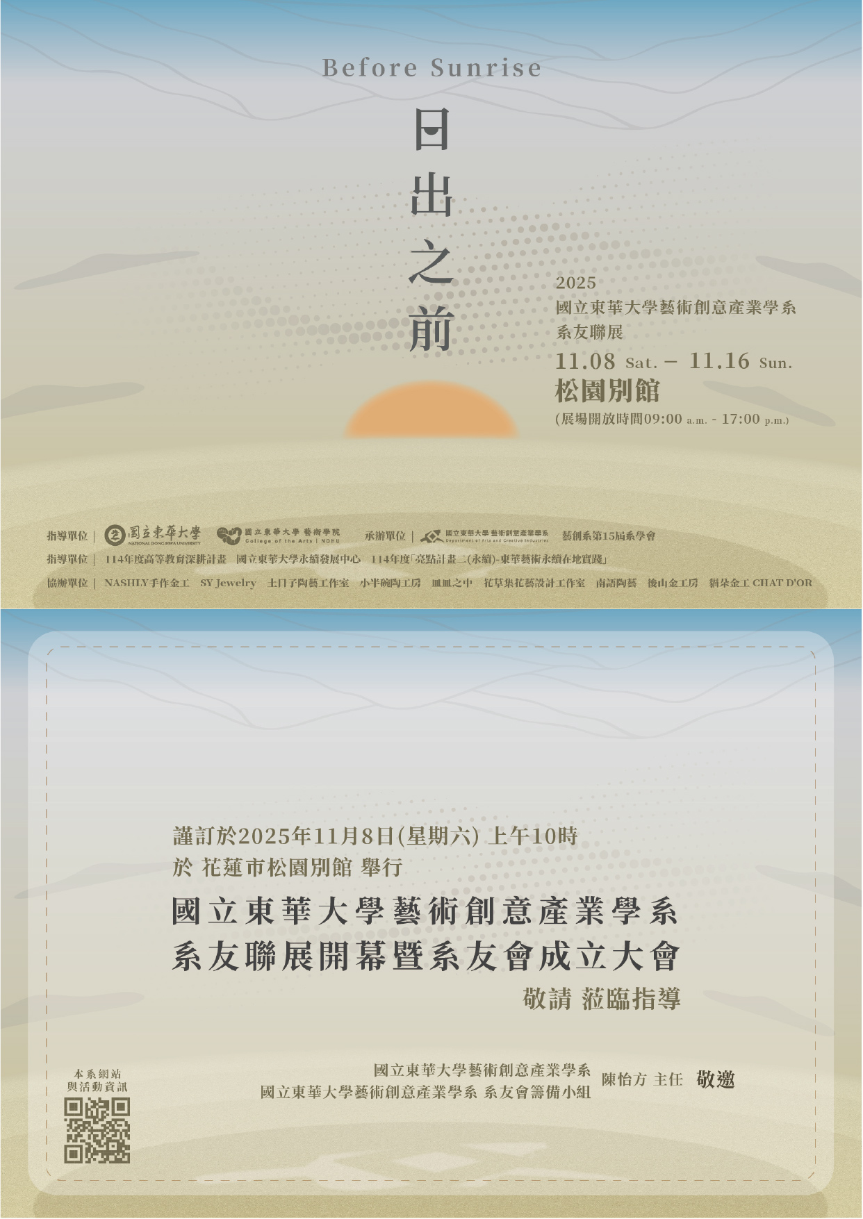 分類: 活動公告, 其他公告 來源: 藝術創意產業學系 - 謝明海 - ocean@gms.ndhu.edu.tw - 電話8905889 對象: 全校教職員_全校教師_全校職員_全校學生_兼任教師_退休教職員 標題: 【藝創校慶系列特展】114/11/8~11/16「日出之前-2025國立東華大學藝術創意產業學系系友聯展」敬邀蒞臨11月8日開幕茶會 日期: 2025-11-05  ( 星期三 )  08:21 附檔: 2025日出之前--國立東華大學藝術創意產業學系系友聯展_邀請卡.jpg (618 KB)   日出之前-2025國立東華大學藝術創意產業學系系友聯展.jpg (141 KB)