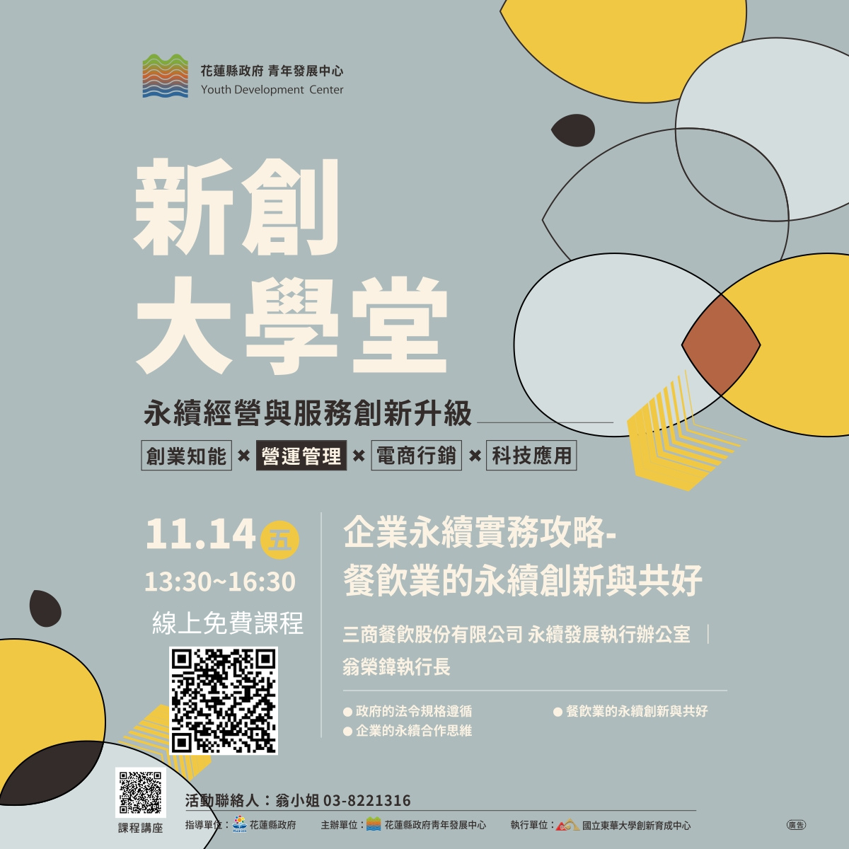 本周五線上創業培力課程 x 歡迎學員參與 【企業永續實務攻略:餐飲業的永續創新與共好】 想創業,不只要會開店,更要懂得「長久經營」的關鍵! 聚焦永續經營核心實務,從法規合規、合作模式、到創新策略一次解析,協助在初期就奠定「社會責任 × 市場競爭力」兼具的經營思維,打造讓顧客、社區與品牌都能共好的事業! 📘 企業永續實務攻略-餐飲業的永續創新與共好 📅 11/14(五)13:30–16:30 (於12:30開放進場) 📍講師|三商餐飲集團永續發展執行辦公室 翁榮鍏 執行長 📍 線上課程連結|https://meet.google.com/swx-cftb-qeb 主辦單位:花蓮縣政府青年發展中心 承辦單位:國立東華大學創新育成中心
