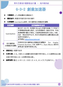 一、旨揭計畫為強化青年之國際創業視野及實戰能力,促進青年掌握新創趨勢與跨國市場經驗,培育具國際競爭力之創業人才,並建立青年與美國創投、生態圈導師之長期合作關係,拓展國際創業網絡,擴散創業能量與典範,提升國際能見度。 二、旨揭計畫摘要如下: (一)計畫名稱:G-3-2 創業加速器。 (二)主題類別:新創團隊及職能培力。 (三)見習機構:Larta Institute、洛杉磯新創生態圈參訪據點。 (四)見習名額:15名,本案 2/3名額優先提供桃園市青年報名,1/3名額開放給全國各縣市青年報名(含1名弱勢保障名額),每名補助新臺幣32萬元。 (五)圓夢期間:115年5月1日至5月14日,共計 14 天。 (六)青年申請資格: 1、具中華民國國籍 18-30 歲之青年。 2、語文能力:具備中高等級英文溝通能力,能適應全英語環境(建議具TOEIC650分或同等程度)。 3、優先考慮條件─創業背景: (1)曾參加校園或社會新創/創新競賽並獲獎或入圍。 (2)目前為新創團隊核心成員(須附公司登記或團隊簡介) 。 (3)正在開發創新產品/服務並完成最小可行產品(MVP)或市場驗證。 (4)具 STEM、設計、商管等領域學習或實務經驗,對創業加速器流有認識。 三、自114年11月3日起開放報名至114年12月31日止,更多相關資訊請上青年百億海外圓夢基金計畫網站查詢 (https://twpathfinder.org/)。如有其他疑問,請聯繫青年百億海外圓夢基金計畫專案小組:02-2377-1388。 四、本案青年百億海外圓夢基金計畫-「創業加速器」簡章如附件。 🔥更多徵才、就業、考試、實習、職涯講座訊息,請上學務處畢業生及校友服務組網站🔥 https://rb005.ndhu.edu.tw/p/412-1005-493.php
