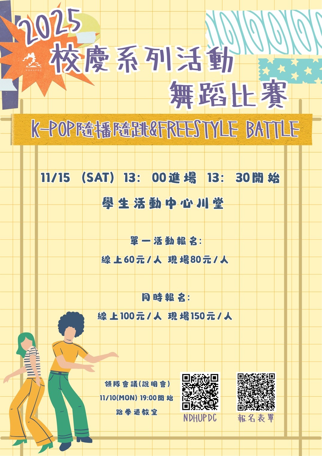 分類: 活動公告 來源: 體育中心 - 東華大學熱舞社吳家瑋 - yyy@gms.ndhu.edu.tw - 電話0907962580 對象: 全校教職員_全校學生_兼任教師_退休教職員_教職員眷屬 標題: 《2025年校慶舞蹈比賽》歡迎觀賽與報名 日期: 2025-11-13  ( 星期四 )  12:07