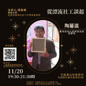 講座介紹|從「漂流社工」談起 本講座邀請長期投入社區行動與青年陪伴的陶蕃瀛老師,分享他從「漂流社工」參與和行動的經驗,從社工教育到社會參與、社工權益爭取到行動反思、從社區現場到社會運動,在變動社會中重新想像社工角色的可能性,協助社工與助人工作者思考自身在社會脈絡中的定位與專業行動。 講師介紹|陶蕃瀛 社區實踐者與社工教育工作者,以彈性、跨域與情境式的實務方法著稱,關注在地脈絡中的公共性、社工角色轉換以及世代之間的行動連結。作品與分享多聚焦於現場觀察、行動經驗與專業反思,是社工與社區議題中的活躍實踐者。 職稱:臺灣福氣社區關懷協會理事長、漂流社工成員 時間:114年11月20日(四),19:30-21:30時。 地點:花蓮港山林事業所(花蓮縣花蓮市菁華街6號) 人數:限30位。 報名連結:https://forms.gle/QZL4r6364ceZNoBQ6 報名時間:即日起至11/18,中午12點(人數提早額滿即關閉報名表單)。 備註: 1. 預計11/18,下午5點前寄送報名成功通知。 2. 人數提早額滿30位即關閉報名表單。 主辦單位 : 花蓮縣社會工作人員職業工會 辦理單位 : 東華大學民族發展與社會工作學系 有任何問題請來信。鐘助理lingya@gms.ndhu.edu.tw