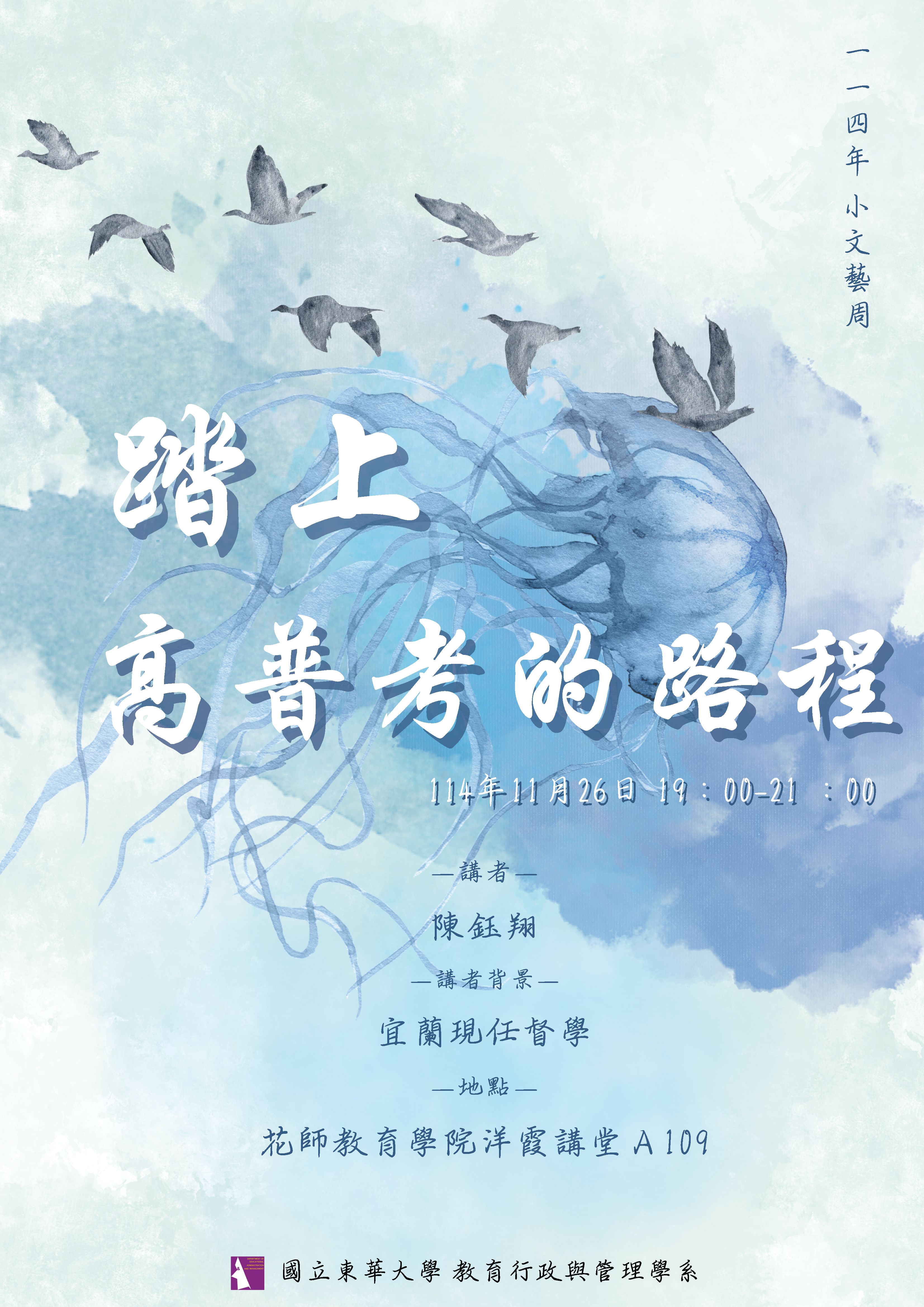 教行系小文藝週|踏上高普考的路程 📅 時間|2025年11月26日(三)19:00-21:00 📍 地點|花師教育學院 A109 洋霞講堂 👤 講師|陳鈺翔 督學(宜蘭縣政府教育處) 📢 截止報名|2025.11.23 12:00 為了讓同學更深入了解教育行政的專業脈絡,並在探索職涯方向時有更明確的參照,本次小文藝週特別邀請到宜蘭縣政府教育處督學──陳鈺翔老師,帶來一場深度與溫度兼具的分享。 從第一線教學現場到教育行政核心位置,陳老師以多年實務經驗與敏銳的觀察視角,帶領同學拆解「高普考」背後真正考驗的專業力與價值觀。同時,他也分享了在教育體系中堅持教育理想、面對制度挑戰的真實心路歷程。 我們希望透過這場講座,讓同學不僅獲得清晰可行的準備方向,也看見教育服務蘊含的使命感與無限可能,為自己的未來找到更堅定的步伐。 ------------------------------------------------------------- ⚠️活動可登錄跨域自主學習系統,但網路報名僅作為提醒與參與活動後時數認證,非入場證明!(本系學生登專業成長時數2小時,外系學生登多元進取時數2小時) 跨域自主學習系統: 教行系報名|https://sys.ndhu.edu.tw/SA/XSL_ApplyRWD/ActAnnounce.aspx?ActID=28401 外系報名|https://sys.ndhu.edu.tw/SA/XSL_ApplyRWD/ActAnnounce.aspx?ActID=28400 **報名有分為教行系報名/外系報名 請同學們不要填錯囉!** ⚠️跨域時數於活動結束後兩週內認證,如兩週後未登入請再來信詢問。