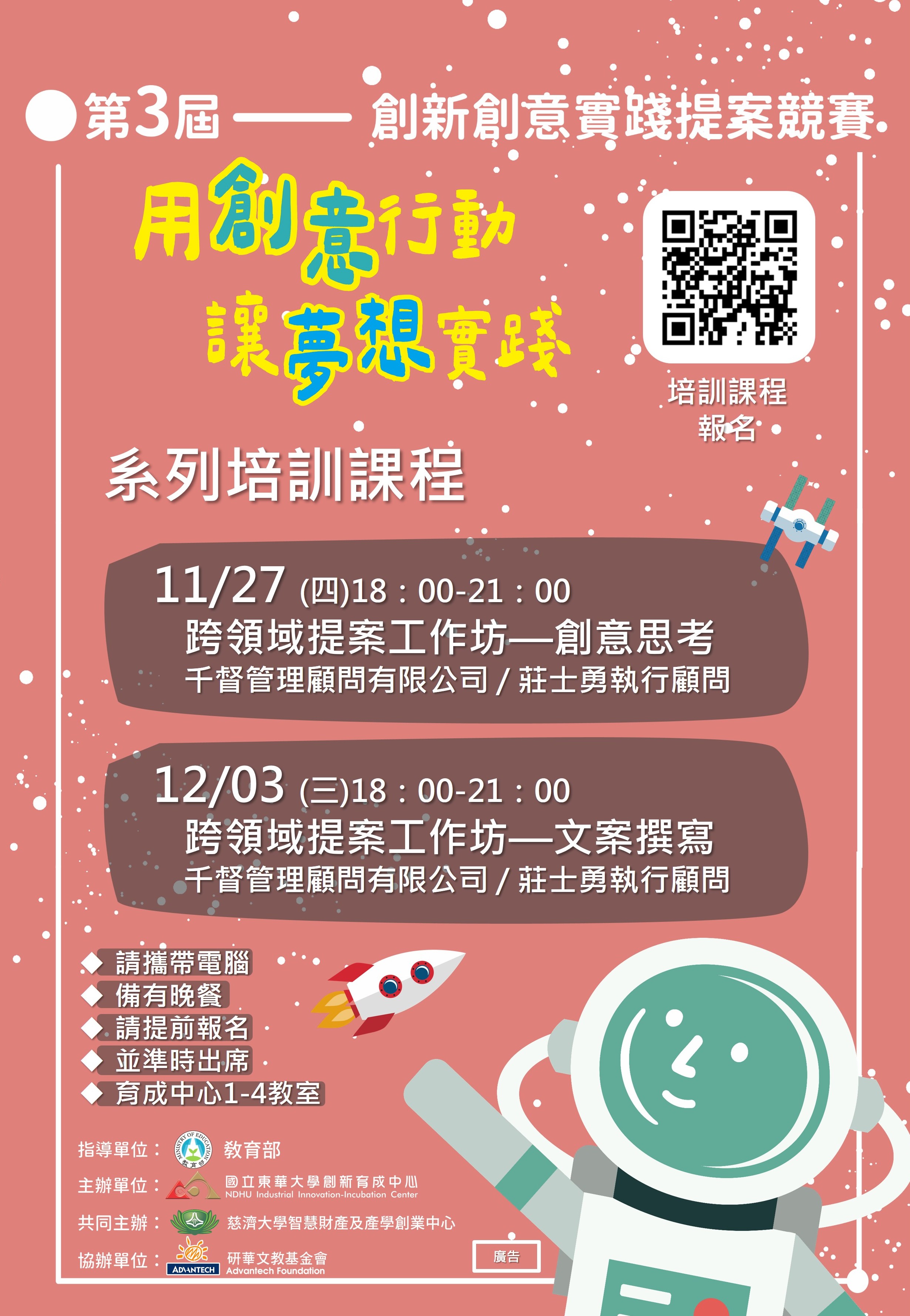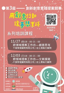 分類: 活動公告, 演講暨研討會, 其他公告 來源: 研發處創新育成中心 - 吳其璁 - dci93031@gms.ndhu.edu.tw - 電話03-8903687 對象: 全校教職員_全校教師_全校職員_全校學生 標題: 第三屆創新創意實踐計畫【用創意行動讓夢想實踐】培訓課程報名表 日期: 2025-11-18  ( 星期二 )  17:49 附檔: 培訓課程海報1127.1203.jpg (960 KB)