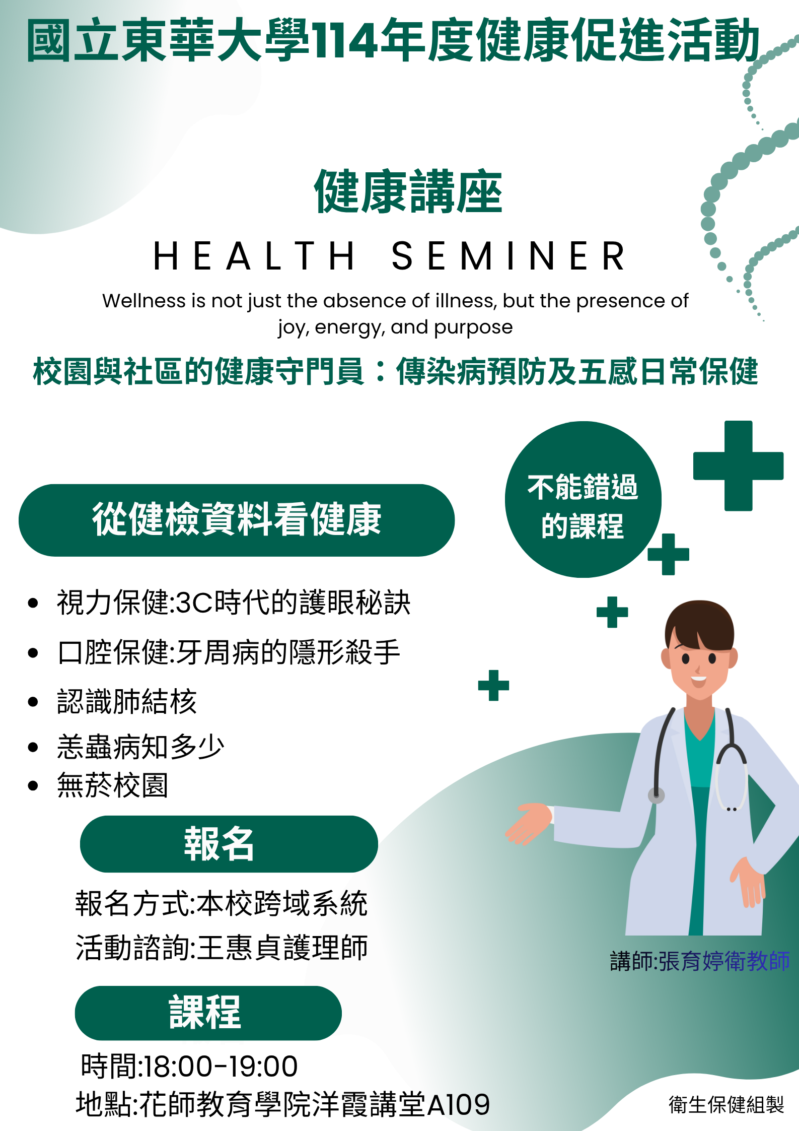 分類: 課程公告 來源: 學務處衛生保健組 - 王惠貞 - labi@gms.ndhu.edu.tw - 電話8906253 對象: 全校學生 標題: 【健康促進講座】校園與社區的健康守門員:傳染病預防及五感日常保健 日期: 2025-11-24  ( 星期一 )  08:42 附檔: 國立東華大學114年度健康促進活動 (1).png (690 KB)