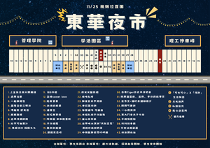分類: 活動公告 來源: 學務處課外活動組 - 姜紫淇 - yaya@gms.ndhu.edu.tw - 電話03-8906235 對象: 全校教職員_全校學生 標題: 本學期東華夜市(第四場)來囉!! 日期: 2025-11-24  ( 星期一 )  09:35 附檔: 海報.pdf.pdf (2 MB)   東華夜市-(第四場)攤位圖-中文版.png (2 MB)   東華夜市-(第四場)攤位圖-英文版.png (2 MB)   自行車停放架區域(附件).pdf (176 KB)