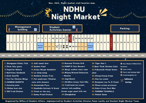 上一場的夜市因為颱風影響取消了😭 好多東華夜市愛好者,都在問什麼時候還有夜市!!11/25夜市又回來啦~ 最近天氣轉涼了,夜市逛起來更舒服了🙌🏻 快來吃好久不見的夜市小吃,中間的許願攤和校內攤有新朋友跟好久不見的老朋友! 11/25我們在學活前的東華夜市等你來探索❤️🔥 FB:https://www.facebook.com/share/18c5Zea14Z/?mibextid=LQQJ4d IG:https://www.instagram.com/ndhu_nightmarket?igsh=Mm5lMTVheDRub2Vu 環保餐具租借影片教學:https://reurl.cc/4LaElK 📌PS.夜市海報及攤位圖如附件 💫第四場夜市 時間:11/25(二)16:00~21:00 地點:學活園區前道路 主辦單位:學生事務處 協辦單位:學生夜市團隊 ⚠️注意事項: 一、請同學將腳踏車停放於學活園區前自行車停放架區域,如附件所示,謝謝各位同學的配合。 二、學活園區左右二側因活動攤商擺攤位置及活動參與者用路人安全考量,故學活園區二側停車格(靠近管院那側停車格12格,靠近理工那側停車格12格)於活動當日做為管制範圍。 三、9成以上攤商提供自行攜帶環保餐具可折5元,請大家多多利用。