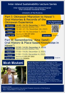 演講者: Micah Mizukami 先生 (夏威夷大學馬諾阿校區口述歷史中心副主任) ----------------------------------------------------------------------------- 第一場講座 主題: 沖繩移民至夏威夷:口述歷史與沖繩經驗紀錄 時間(台灣): 2025/12/1(一)13:40–15:10 地點: 通識教育館 3-301 線上參加:Zoom https://zoom.us/j/8332572503?pwd=2jZbmE7NxXxo1iG3sseKgvtB5ox4ly.1&omn=92595624566 會議 ID: 833 257 2503 密碼: RQ409n --------------------------------------------------------------- 第二場講座 主題: 記憶 ʻĀina(土地):夏威夷的口述歷史與地方知識 時間(台灣): 2025/12/4(四)11:50–13:20 地點: 通識教育館 3-104 線上參加:Zoom https://zoom.us/j/8332572503?pwd=2jZbmE7NxXxo1iG3sseKgvtB5ox4ly.1&omn=93513808452 會議 ID: 833 257 2503 密碼: RQ409n 語言:英語(不提供口譯) 形式:實體 / 線上同步進行
