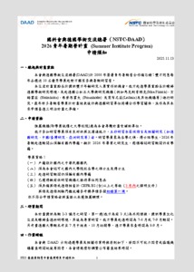 分類: 其他公告 來源: 國際事務處國際學生組 - 彼蕾·比紹 - pux1103@gms.ndhu.edu.tw - 電話+88638905173 對象: 碩士生_博士生 標題: 【2026臺德青年暑期營計畫】NSTC-DAAD Summer Institute Programme 日期: 2025-12-01  ( 星期一 )  15:58 附檔: 國科會與德國學術交流總署(NSTC-DAAD)申請須知.pdf (1 MB)