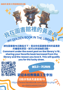 我在圖書館裡的黃金屋My golden book in the library 一、參加資格:限國立東華大學教職員工生參加。 二、活動時間:即日起至12月31日 三、活動方式:請在東華大學圖書資訊處FB活動貼文下,寫出你在圖書館借到的最喜歡的書籍和原因,就可以參加抽獎活動。介紹的書籍不能與其他人重複,如果別人介紹的書籍你也很喜歡,請給他們按讚! 四、獎勵:凡PO文介紹自己喜愛的圖書館書籍者,都可以獲得抽獎資格,1人只能中獎1次。將抽出30名,每位可獲得超商禮券200元。 五、活動結束後公告得獎名單,館方將私訊得獎者領獎密碼,請攜帶本校學生證或教職員證和領獎密碼至圖書館領取獎勵品。 六、活動獎勵品贊助:感謝知訊圖書有限公司、UDN電子書聯盟 圖書資訊處FB https://www.facebook.com/profile.php?id=100064669226237 ============== Eligibility: All faculty, staff, and students of National Dong Hwa University are welcome to participate. How to Participate: Comment under the event post on the library’s Facebook page, sharing your favorite book borrowed from the library and the reason you love it. This will qualify you for the lucky draw. Each book introduced must be unique—if someone else has already introduced a book you also love, please give their post a “like”! Rewards: Everyone who posts about their favorite library book will be eligible for the lucky draw. Each person can win only once. Thirty winners will be selected, and each will receive a NT$200 convenience store gift voucher. The list of winners will be announced after the event. Each winner will receive a private message from the library containing a prize collection code. Please present your valid student ID or faculty/staff ID along with the collection code at the library to claim your prize. Sponsors: Zhixin Book Co., Ltd., UDN eBook Alliance. 圖書資訊處FB https://www.facebook.com/profile.php?id=100064669226237