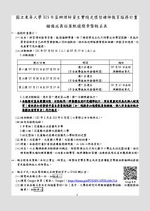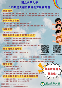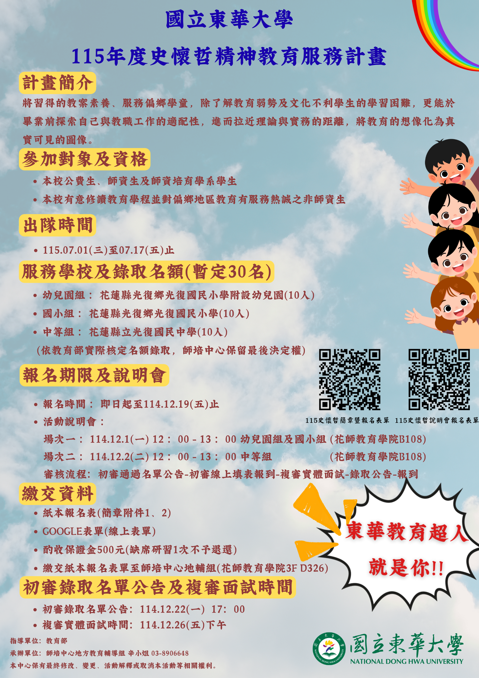 分類: 活動公告, 其他公告 來源: 師資培育中心 - 辛金玉 - vup182025@gms.ndhu.edu.tw - 電話8906648 對象: 全校學生_大一_大二_大三_大四以上_碩士生_博士生 標題: 115年史懷哲精神教育服務計畫成員招募甄選中 日期: 2025-12-12  ( 星期五 )  12:24 附檔: 115史懷哲-師資生招募簡章報名表(公告版).pdf (206 KB)   115史懷哲-師資生招募簡章報名表(公告版).doc (145 KB)   國立東華大學_115年度史懷哲精神教育服務計畫-海報_.png (3 MB)