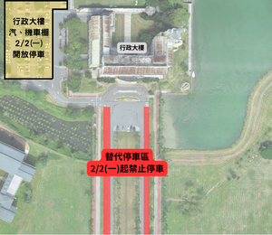 分類: 行政公告 來源: 總務處營繕組 - 張宗玲 - AJ0191@gms.ndhu.edu.tw - 電話8906377 對象: 全校教職員_全校學生_兼任教師 標題: 行政大樓太陽光電停車場於2/2(一)啟用暨臨時替代停車區裁撤公告 日期: 2026-01-16  ( 星期五 )  16:31 附檔: 1150116-公告附圖-替代停車區2.2起禁止停車.png (1 MB)