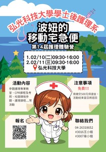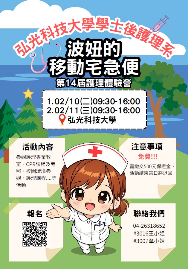 一、活動目的:藉此活動讓家長及學生了解學士後護理系特色及學習環境以利選擇適合的教育環境。學系各師生從其任務、願景、目標呈現其價值主張,期待有興趣的學生們一起來參與,並體驗學士後護理系與眾不同的學習環境,也提供對護理領域有興趣的學生進一步了解此專業。 二、主辦單位:弘光科技大學學士後護理系。 三、參加對象:對護理有興趣之大學應屆畢業生或取得學士學位的社會人士。 四、活動時間:共兩梯次。 (一)第一梯次:115年02月10日(二)09:30-16:00。 (二)第二梯次:115年02月11日(三)09:30-16:00。 五、活動地點:該校E棟護理大樓。 六、活動內容:參觀護理專業教室、CPR課程及考照、校園環境參觀...等。 七、報名方式及活動相關詳細說明請參閱活動海報。 八、報名網址https://forms.gle/xQarHnZM2XBHHoDd6 🔥更多徵才、就業、考試、實習、職涯講座訊息,請上學務處畢業生及校友服務組網站🔥 https://rb005.ndhu.edu.tw/p/412-1005-493.php
