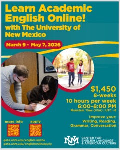 ◎時間:2026.3.9~2026.5.7(每週約10小時) ◎地點:線上課程 ◎費用:USD 1,450 ◎報名時間:2026.2.27截止 ◎報名流程 1.自行報名: https://emforms.unm.edu/obformsApp/UnityForm.aspx?key=UFKey 2.等待主辦單位通知。 ◎注意事項: 1.有任何申請問題可以聯繫活動承辦人: hjane99@unm.edu 2.具體申請細節及其他資訊請詳閱簡章。 ◎更多課程資訊: https://celac.unm.edu/celac-programs/academic-and-professional-english-online.html